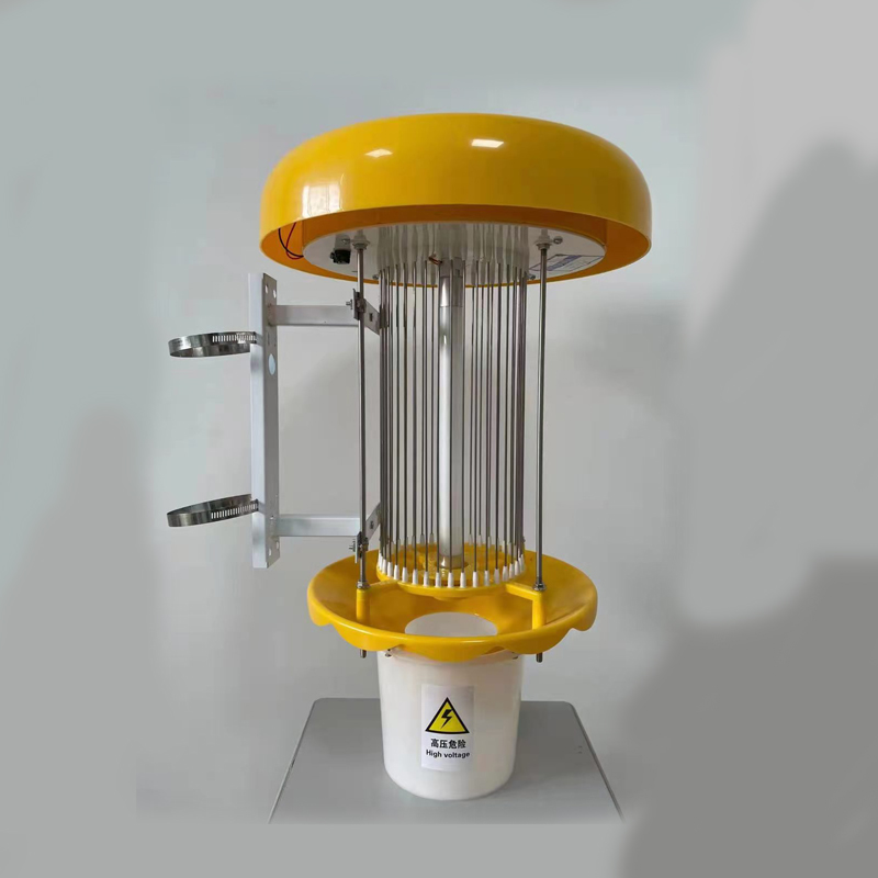 4、 整机外形规格:长*宽*高(330mm*330mm*600mm),灯头材料为ABS塑料(防紫外线、抗老化)颜色:黄色。集虫桶旋转卡扣式接虫桶,有高压危险标示。