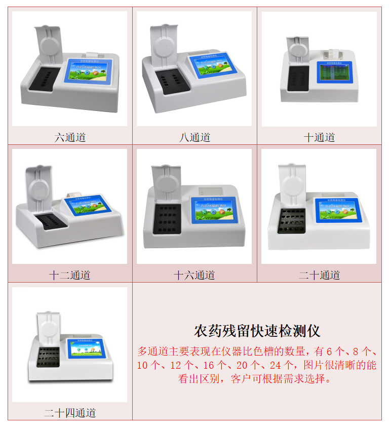 PJ-NC6/8/10/12/16/20/24多通道农药残留快速测定仪,是可选六通道、八通道、十通道、十二通道、十六通道、二十通道、二十四通道,用于蔬菜、水果、茶叶等有机磷和氨基甲酸酯类农药残毒含量的检测,特别适用于农业基地和专业户采摘前的速测;农贸批发市场、蔬菜配送中心的现场速测;超市、食堂等加工前速测。