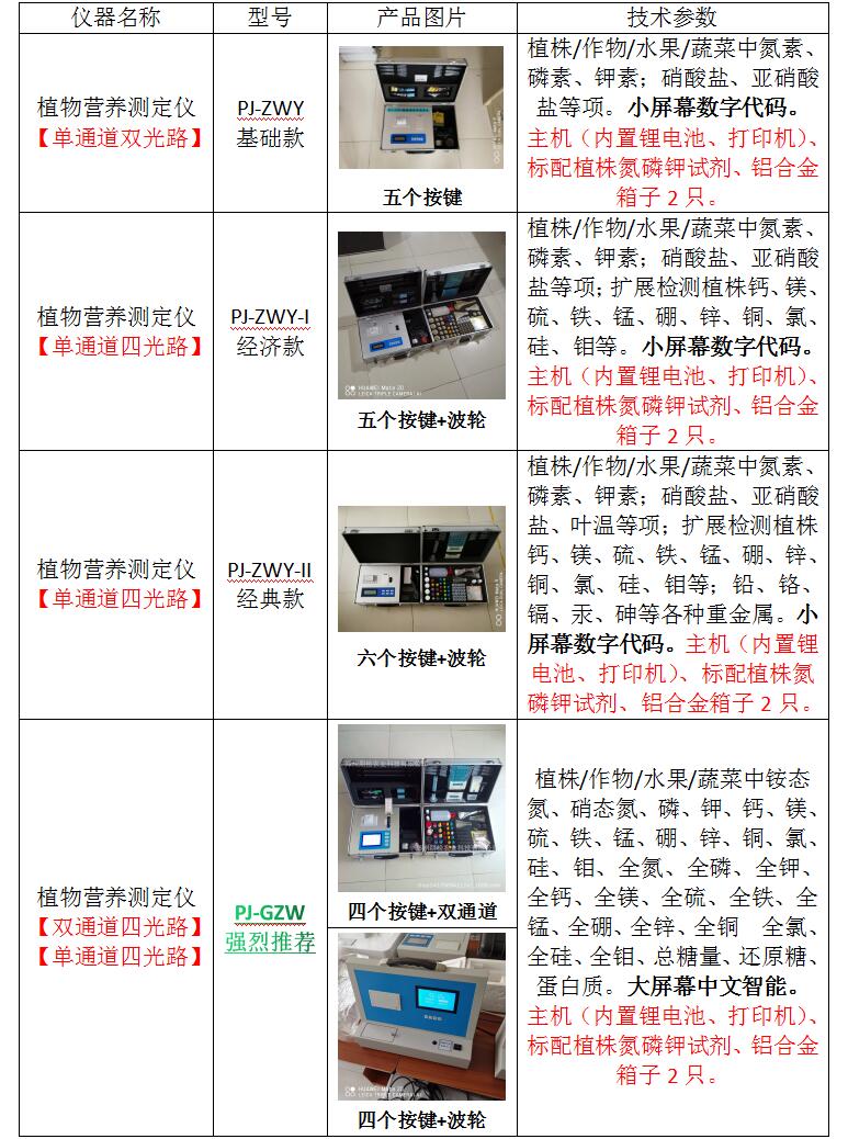 植株中的氮素、磷素、钾素、亚硝酸盐、叶温; 植株中钙、镁、硫、铁、锰、硼、锌、铜、氯、硅、钼等微量元素; 铅、铬、镉、砷、汞等重金属 |